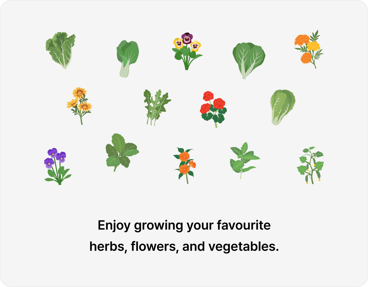 • The app automatically sets the optimal growing conditions for your registered plants, including temperature, humidity, and light.