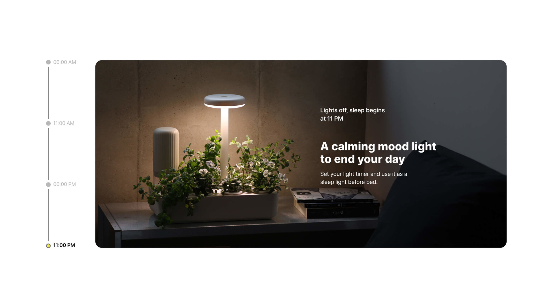 | Lighting cycles on and off based on plant growth and ambient light, reducing energy consumption. |