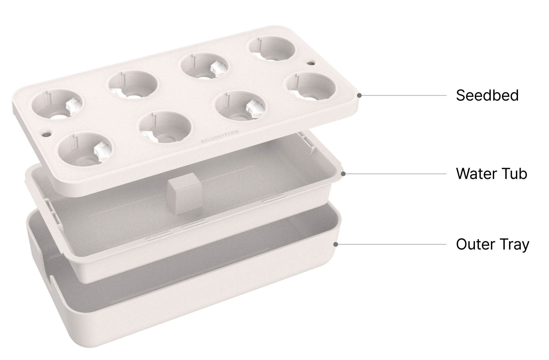 | Water flows gradually from the NutriFlow Bottle into the Seedbed, and any excess stays in the Water Tub, keeping the roots exposed to air. |